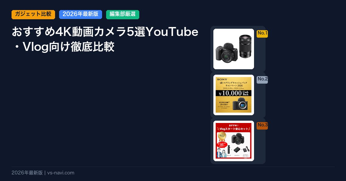 「YouTube・Vlogを始めたいが何を買えばいい?」「4K対応のカメラは?」という方のために、2026年の4K動画カメラおすすめ5選を予算・用途別に厳選しました。スマホ超えの映像品質を実現する最適な1台を見つけてください。