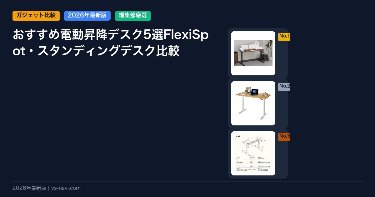 「座りすぎは寿命を縮める」という研究結果が注目され、スタンディングデスクは在宅ワーカーとオフィスワーカーの両方で急速に普及しています。電動昇降デスクは立ち座りをボタン一つで切り替えられるため、固定式スタンディングデスクより継続しやすく健康効果も高いです。本記事ではFlexiSpotを中心とした人気5モデルを比較します。