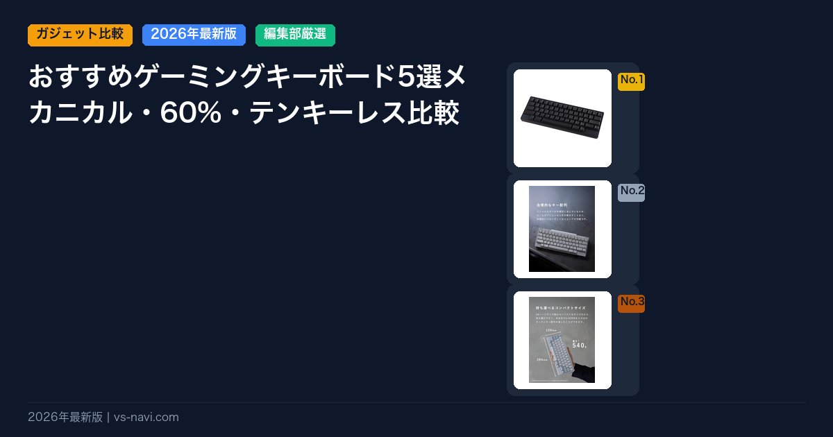 ゲーミングキーボード選びで最初に決めるべきはキースイッチの種類とフォームファクター(サイズ)です。スイッチは主に①リニア(赤軸・クリック感なし、静音)②タクタイル(茶軸・軽いバンプ感)③クリッキー(青軸・カチカチ音)の3種。フォームファクターは100%フルサイズ・TKL(テンキーレス)・65%・60%などがあります。本記事では2026年4月人気の5モデルを比較します。