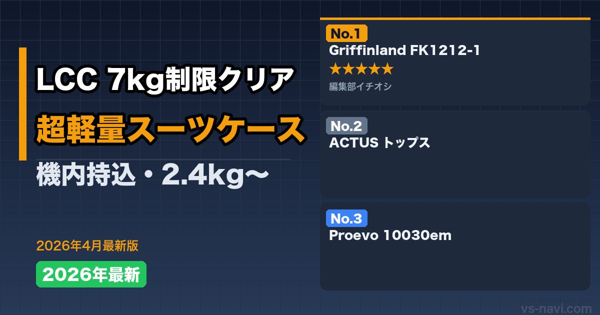 Peach・Jetstar・Spring Japanなど国内LCCの機内持込手荷物は合計7kg。一般的なスーツケースは本体だけで3〜4kgあり、中身を入れると余裕がない。本体重量2.4〜3.5kg・容量22〜30Lの超軽量モデルなら、衣類+ガジェット+お土産まで7kg以内に収まります。